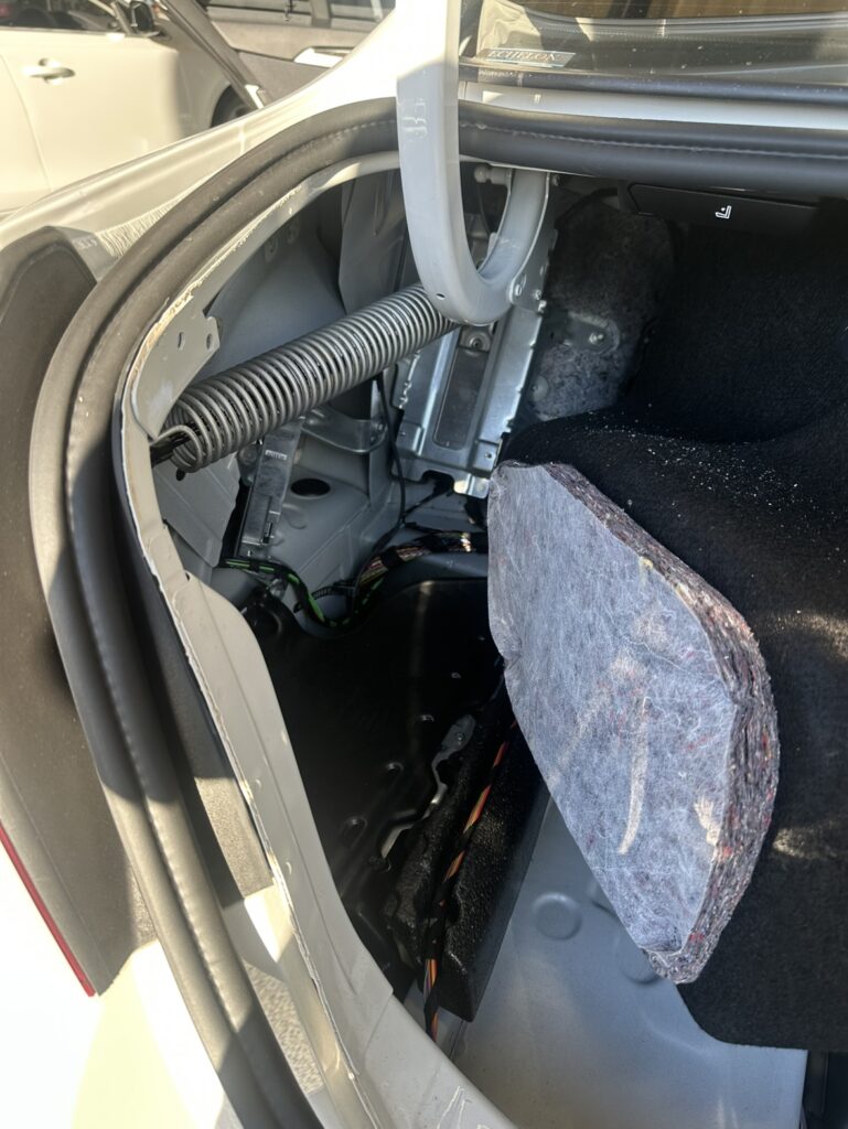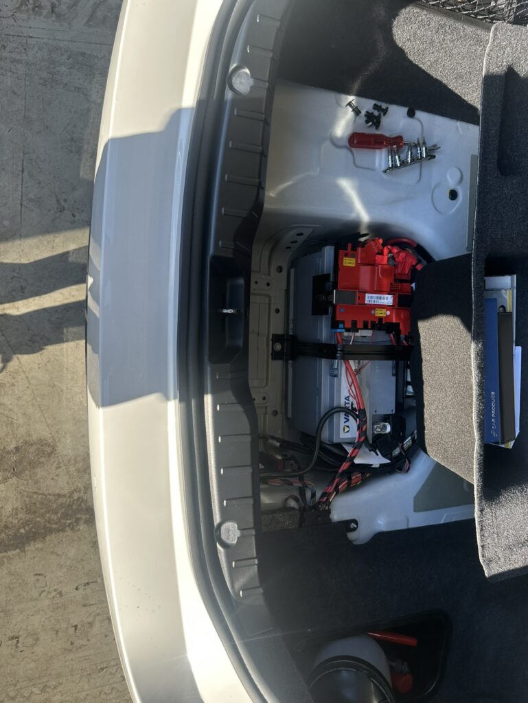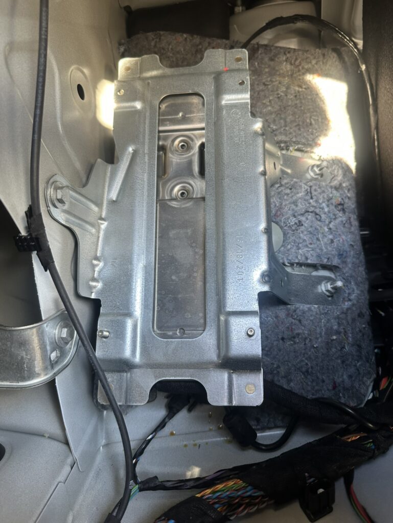 まずSOSバッテリー交換にあたりトランクルーム左側の内張りを分解し、覗き込むとシルバー色の鉄板がナット2個とボルト1本でとまっている物があるので取り外します!