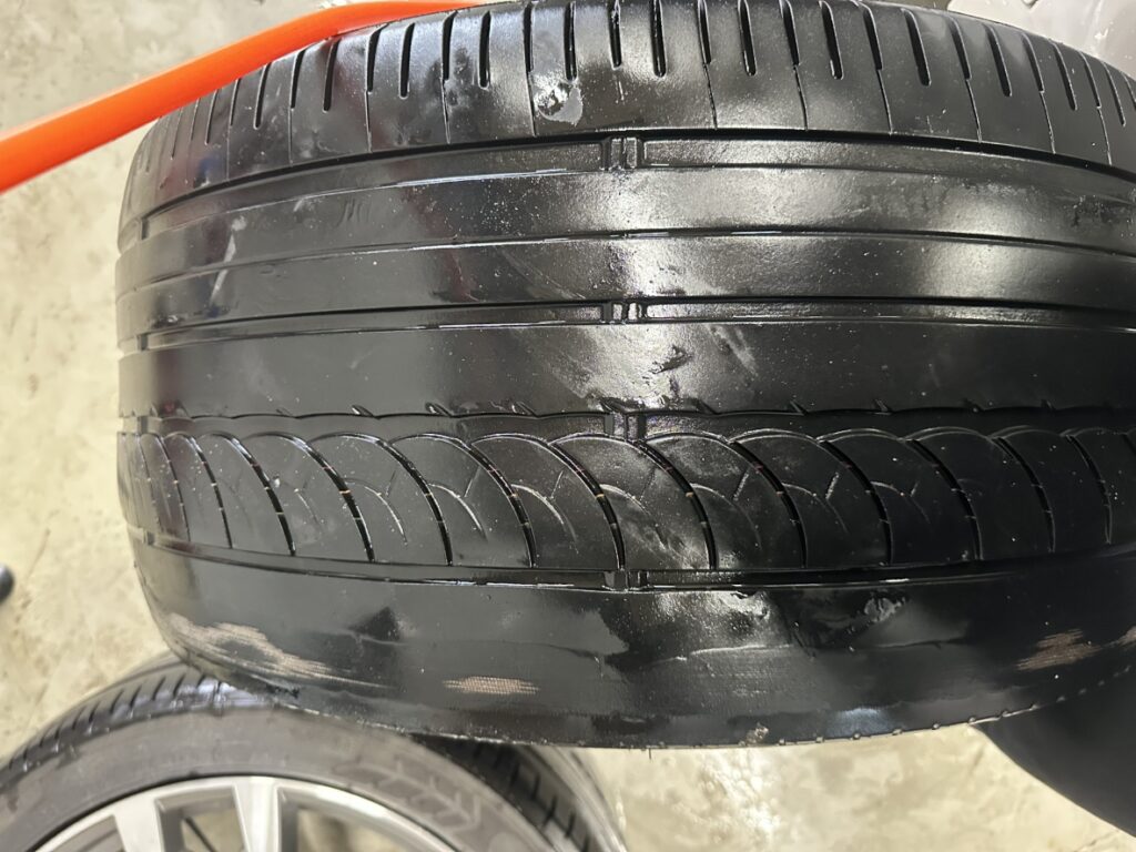 前回、フロントガラス交換にてお預りさせて頂いた際に点検させて頂いた所タイヤの内側の溝が無くなりワイヤー面が出ていることが判明し、とても危険な状態でいつバーストしてもおかしくない状況だった為早急な交換をお勧めさせて頂きました!